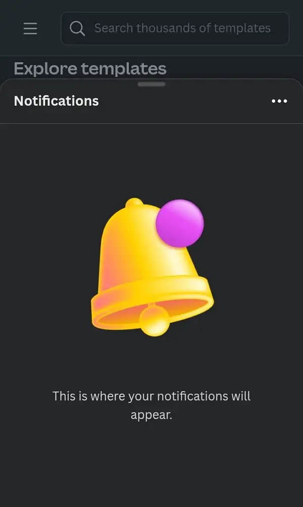 The notification tab in Canva shows updates like shared designs, comments, or team messages. You can open it anytime to catch up on what’s happening in your projects. These alerts show in-app and sometimes as push notifications if you turned them on in your phone settings. Once you’re inside, you can open, read, or even delete the ones you don’t need.